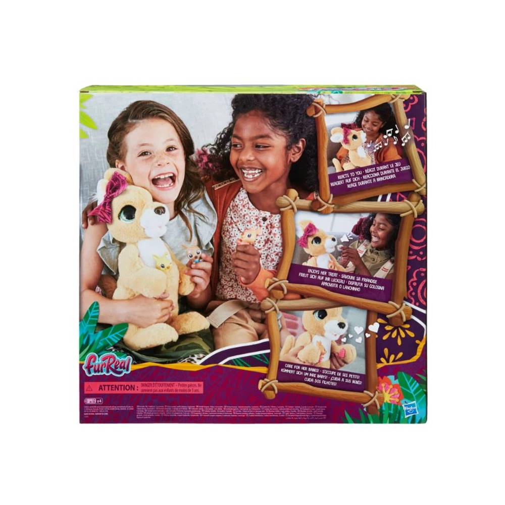 Hop in het rond met deze lieve Mama Josie de kangoeroe van FurReal! Dit schattige, interactieve diertje is net zo lief als haar drie kleintjes. Eentje is een jongen en de andere een meisje, maar de derde blijft een verrassing tot je de set uitpakt. Maar mama Josie bekommert zich niet alleen om haar kleine kangoeroetjes, ze communiceert ook met jou. De interactieve knuffel bevat wel 70 geluids- en bewegingsreacties, inclusief schattige kusgeluidjes, voedergeluiden, een boertje en meer. En ze kan dansen ook! Laat haar een grappig, springend dansje doen en tegelijkertijd muziek afspelen.