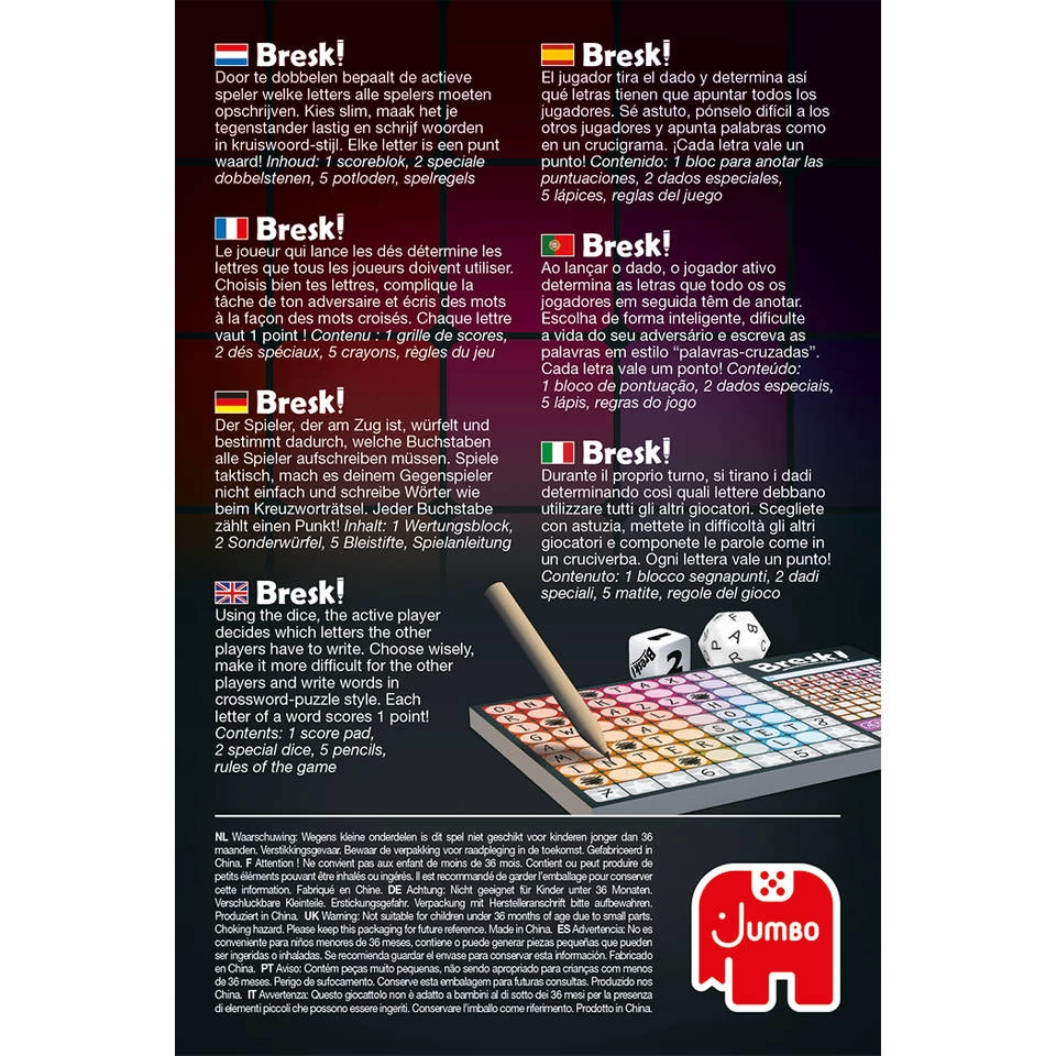 Speel nu samen het uitdagende en gezellige Bresk! Door te dobbelen bepaalt de actieve speler welke letters alle spelers moeten opschrijven. Kies slim, maak het je tegenstander lastig en schrijf woorden in kruiswoord-stijl. Elke letter is een punt waard! De speler die de meeste punten weet binnen te halen wint het spel.