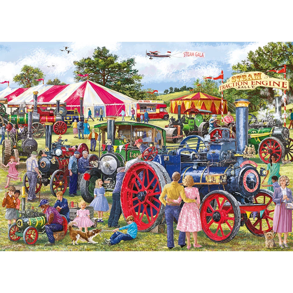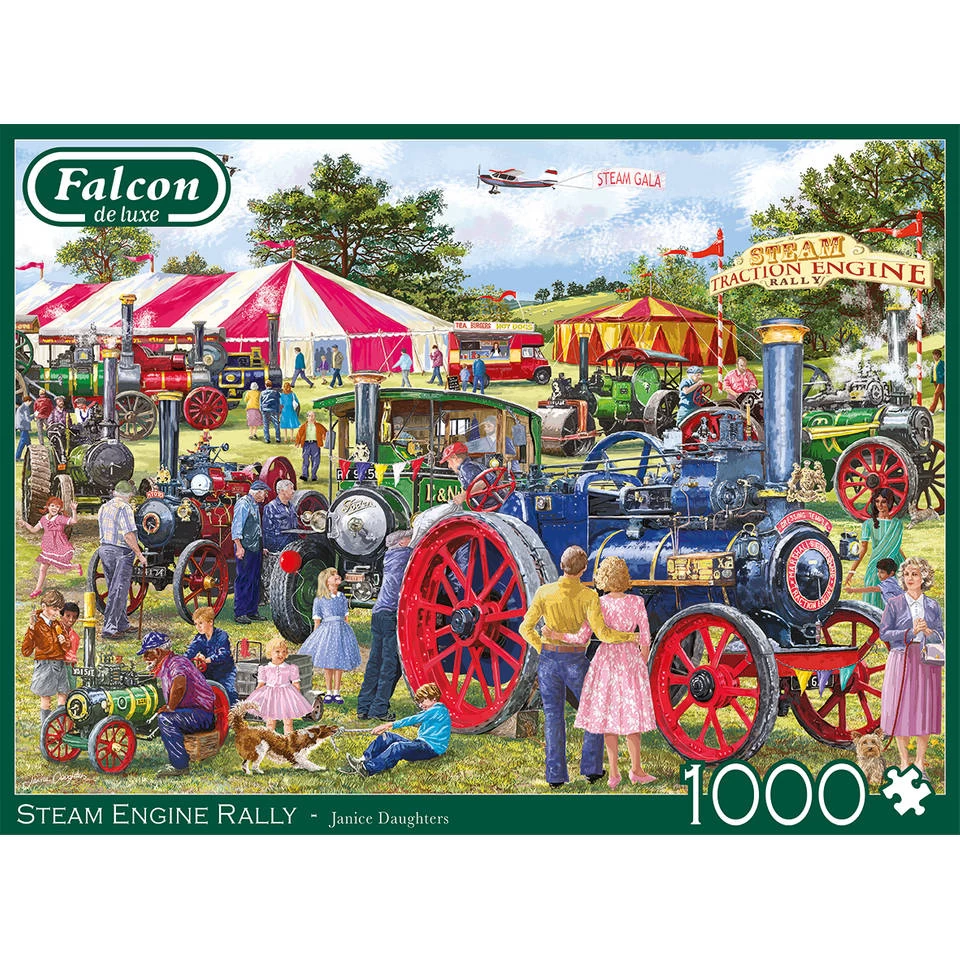 Je haalt een stukje geschiedenis in huis met deze Falcon de luxe puzzel Steam Engine Rally. Op deze rally, wat veelal in Engeland georganiseerd wordt, zie je allerlei oude stoomlocomotieven en andere voertuigen die vroeger gebruikt werden. Als je van treinen houdt dan is deze puzzel een leuke bezigheid.
