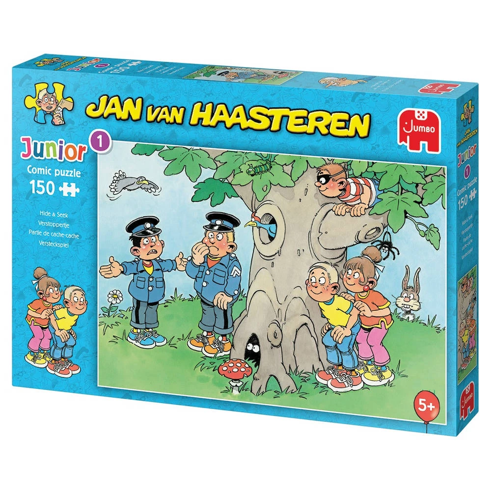1, 2, 3 wie niet weg is, is gezien! Deze Jumbo Jan van Haasteren Junior puzzel Verstoppertje bestaat uit 150 stukjes.