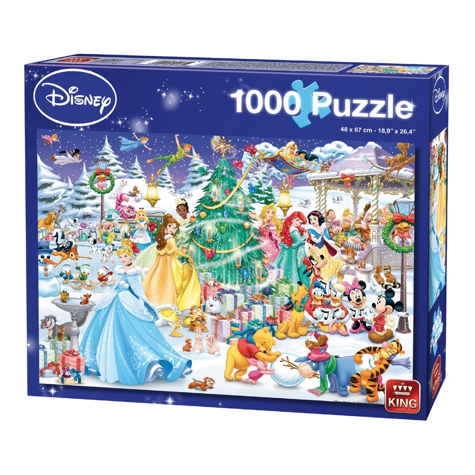 Deze King puzzel van 1000 stukjes heeft een sfeervolle winterplaat met alle bekende Disney figuren zoals Assepoester, Donald, Mickey en anderen.