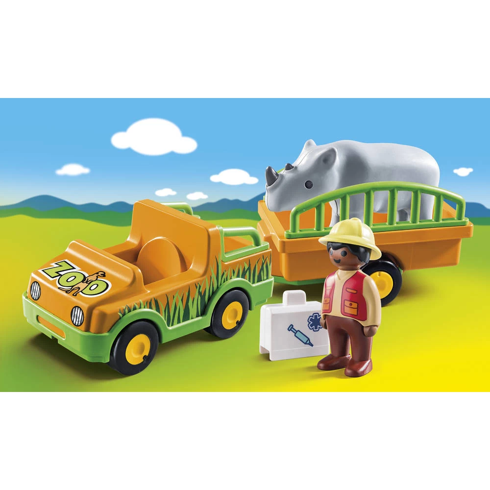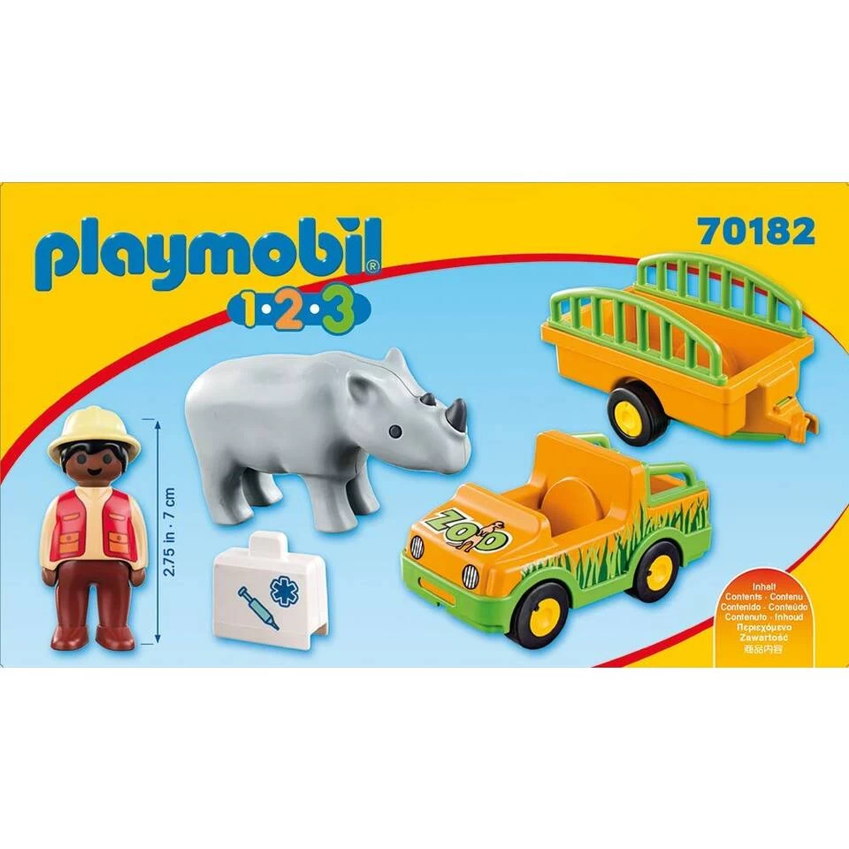 - De set bestaat uit een Playmobil speelfiguur, jeep, trailer en een figuur van een neushoorn.