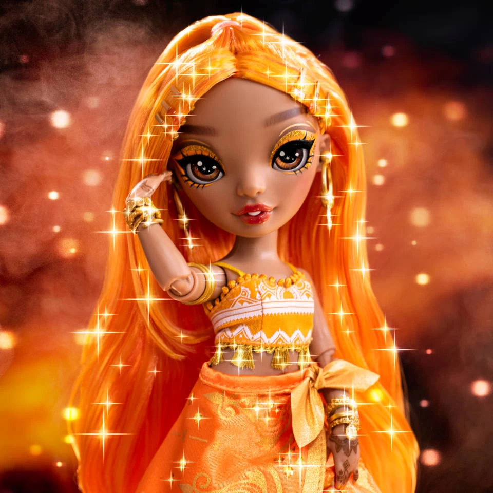 Ben je net zo modebewust als de Rainbow High modepop Meena Fleur? Deze saffraangouden modepop is inclusief wel 2 coole designer-outfits. Mix en match deze outfits met de meegeleverde accessoires en laat je creativiteit daarbij de vrije loop. Deze pop is superleuk voor kinderen om hun eigen creatieve avonturen mee te bedenken. Meena komt uit New Delhi, India, en deelt graag haar culturele erfgoed met haar vriendinnen, zoals de mehndi-lichaamskunst op haar handen. Meena is gericht op Accessoire-ontwerp en ze is dol op het maken van speciale juwelen om haar modieuze outfits te verfraaien. Ze draagt een top met blote schouder en siernagels, een metallic goudkleurige broek met geregen koord op de kuit, platformschoenen en traditionele Indiase juwelen. Haar tweede outfit is een top met kwastjes, een wikkelrok met lovertjes langs de randen, vetersandalen en bijpassende juwelen.