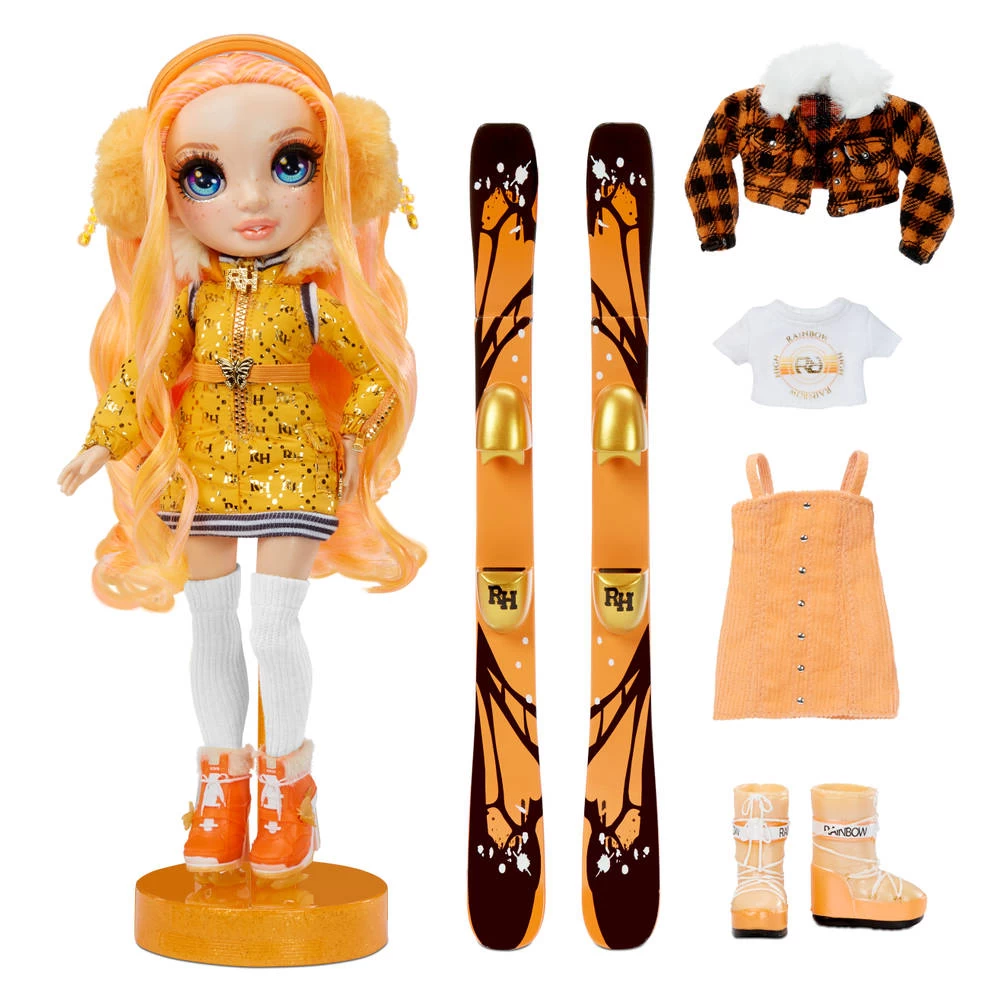 Rainbow High Wintersportvakantie Poppy Rowan oranje modepop en speelset met 2 complete poppenoutfits, paar ski’s en poppenaccessoires met winterthema.