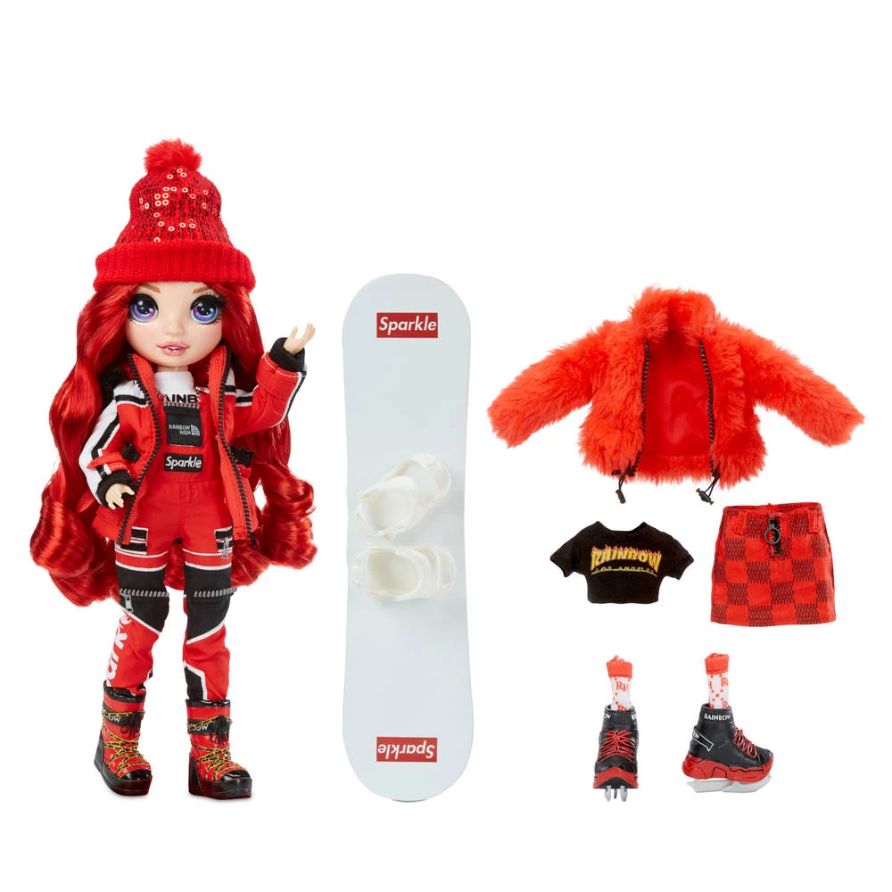 Rainbow High Wintersportvakantie Ruby Anderson rode modepop en speelset met 2 complete poppenoutfits, snowboard en poppenaccessoires met winterthema.