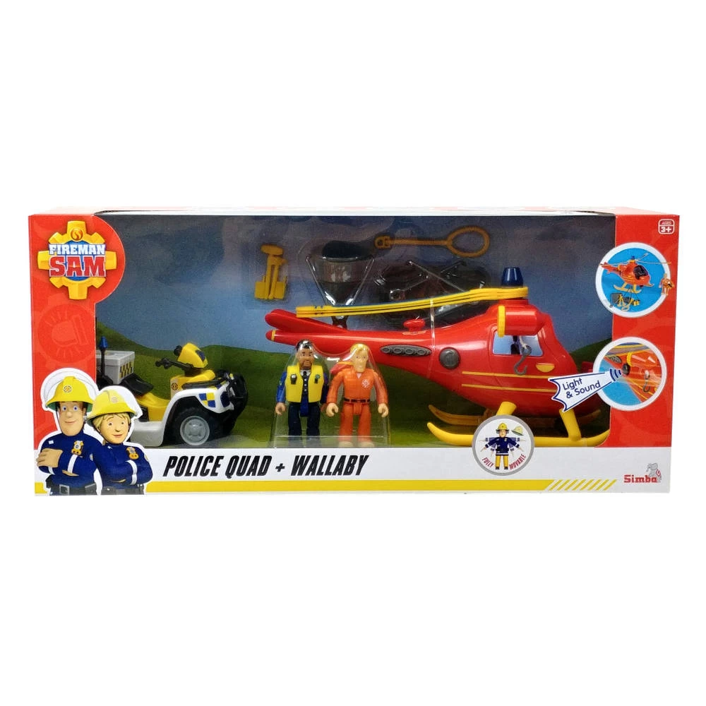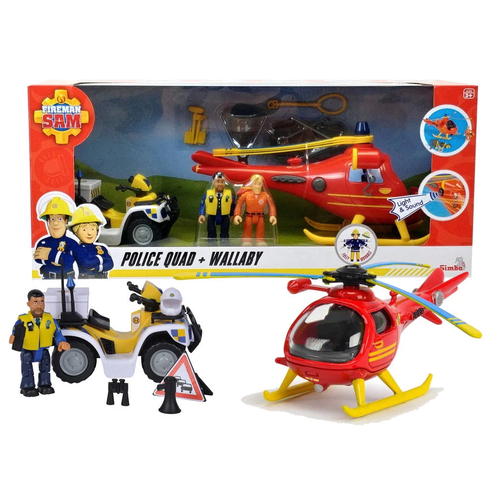 Je kunt je helemaal uitleven met deze Brandweerman Sam helikopter en politiequad. Met de voertuigen kun je de boeven achterna gaan.